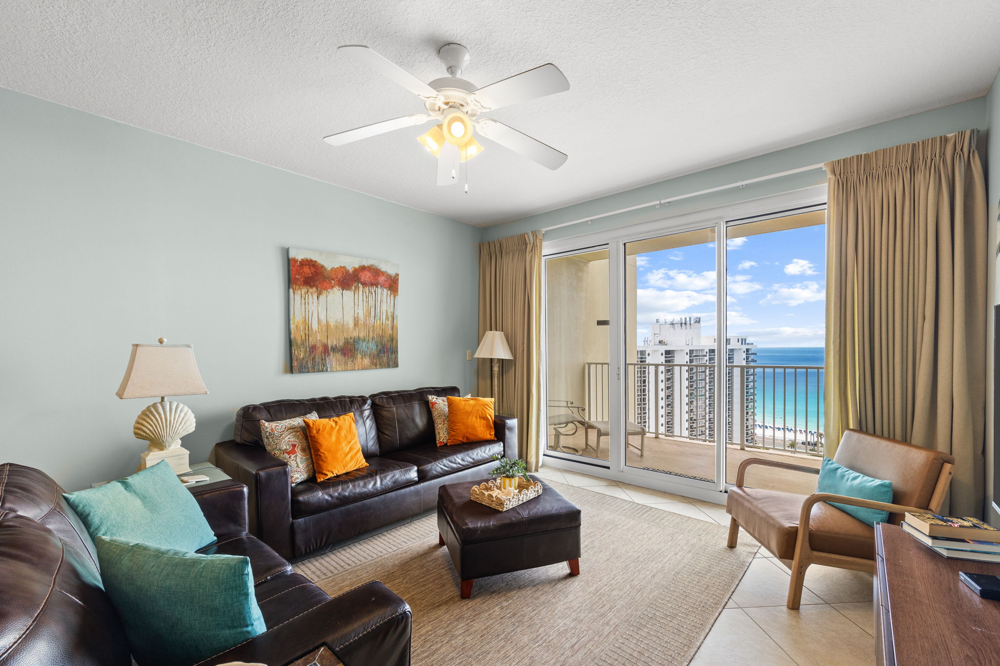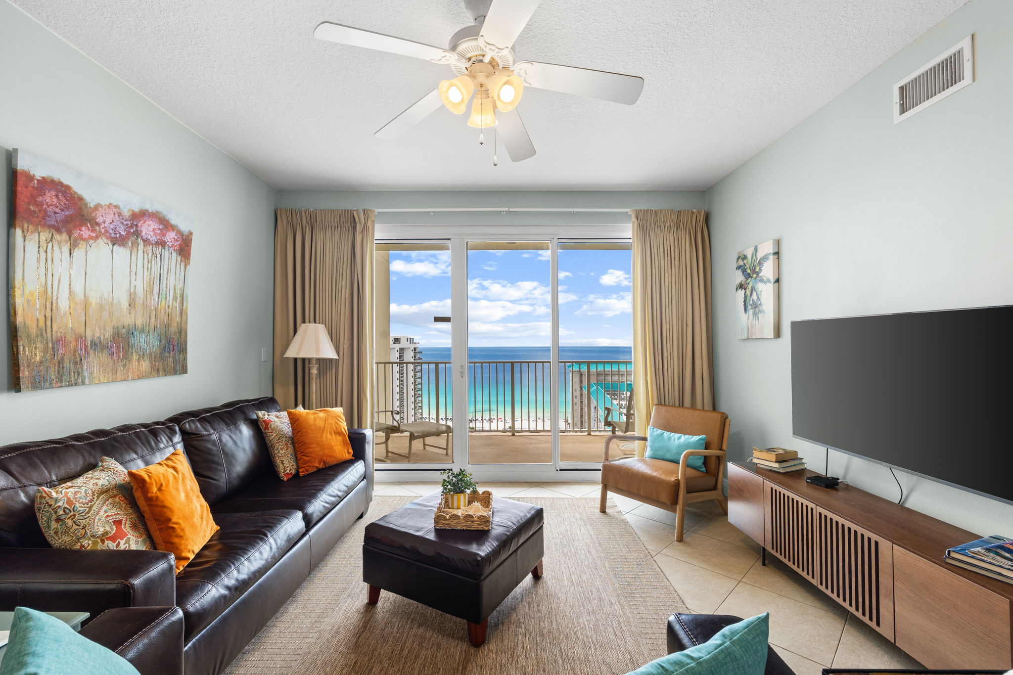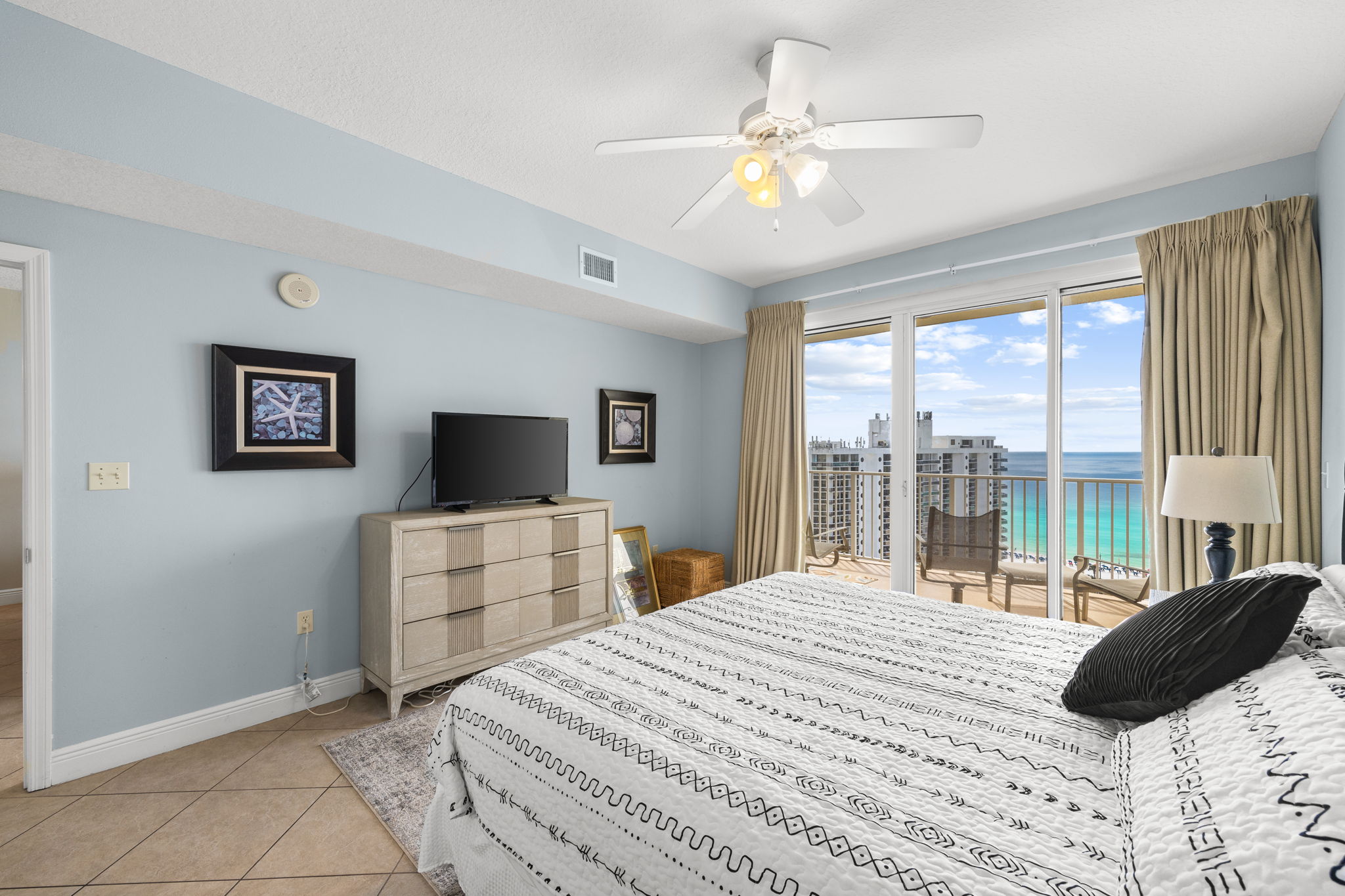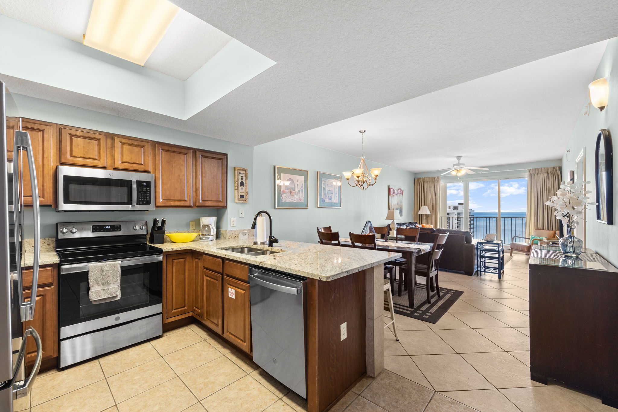 Enjoy all the amenities of the beautiful Seascape Resort and amazing views from this 17th floor condo at Ariel Dunes1! With views of the Choctawhatchee Bay and 18-hole golf course from the front door and spectacular views of the Emerald Coast and Stewart Lake from the back door you may never want to leave. This newly remodeled 2 bedroom, 2 bath condo has it all and is perfect for the kids to have their own space. This spacious floor plan has 9-foot tall ceilings with 8-foot tall sliding glass doors for ocean views from both the living room and master suite. This fifteenth floor condo (1708) in Ariel Dunes I, offers one of the prime locations on Miramar Beach and one of the best views in the building. From your large private balcony, you can enjoy a beautiful view of the Emerald coast! A very short walk to a private beach and you will be relaxing in the sand. This condo sleeps 6 with a king bed in the master bedroom, queen bed in the guest bedroom, and a pull-out sofa in the living room. There are LCD TVs in the master bedroom, guest bedroom and living room. Condo comes with in unit washer/dryer, wifi, cable TV, and fitness room access.