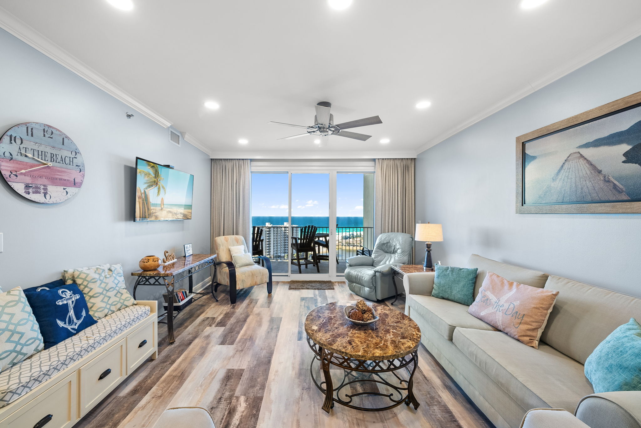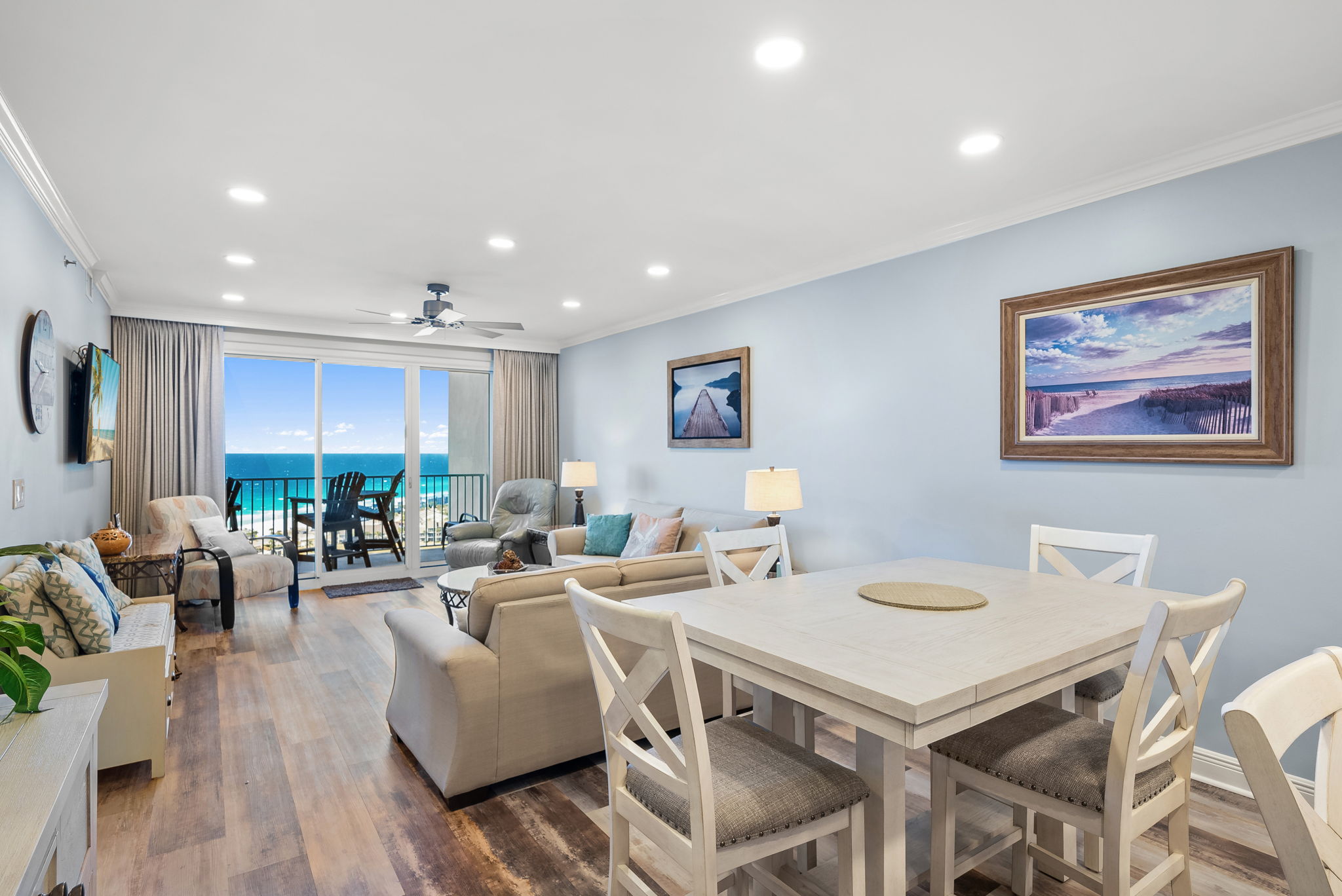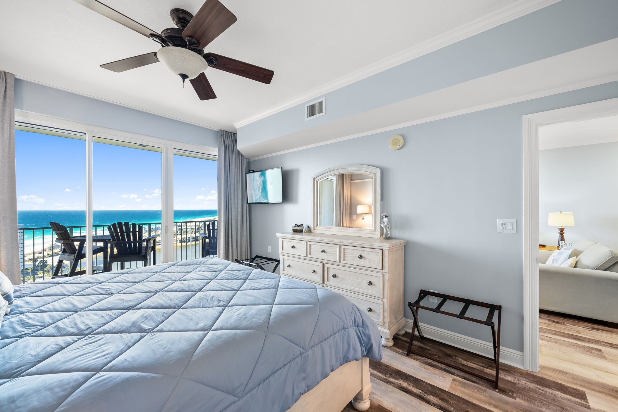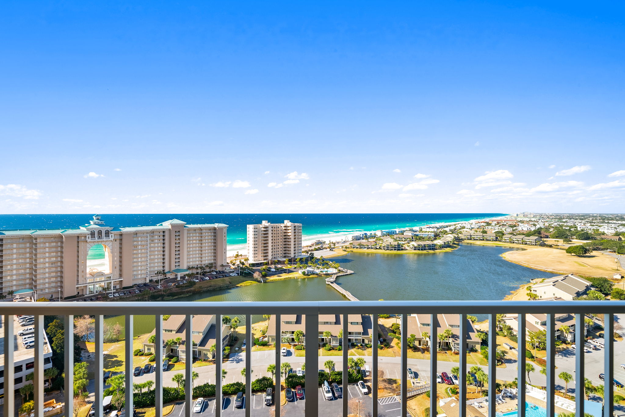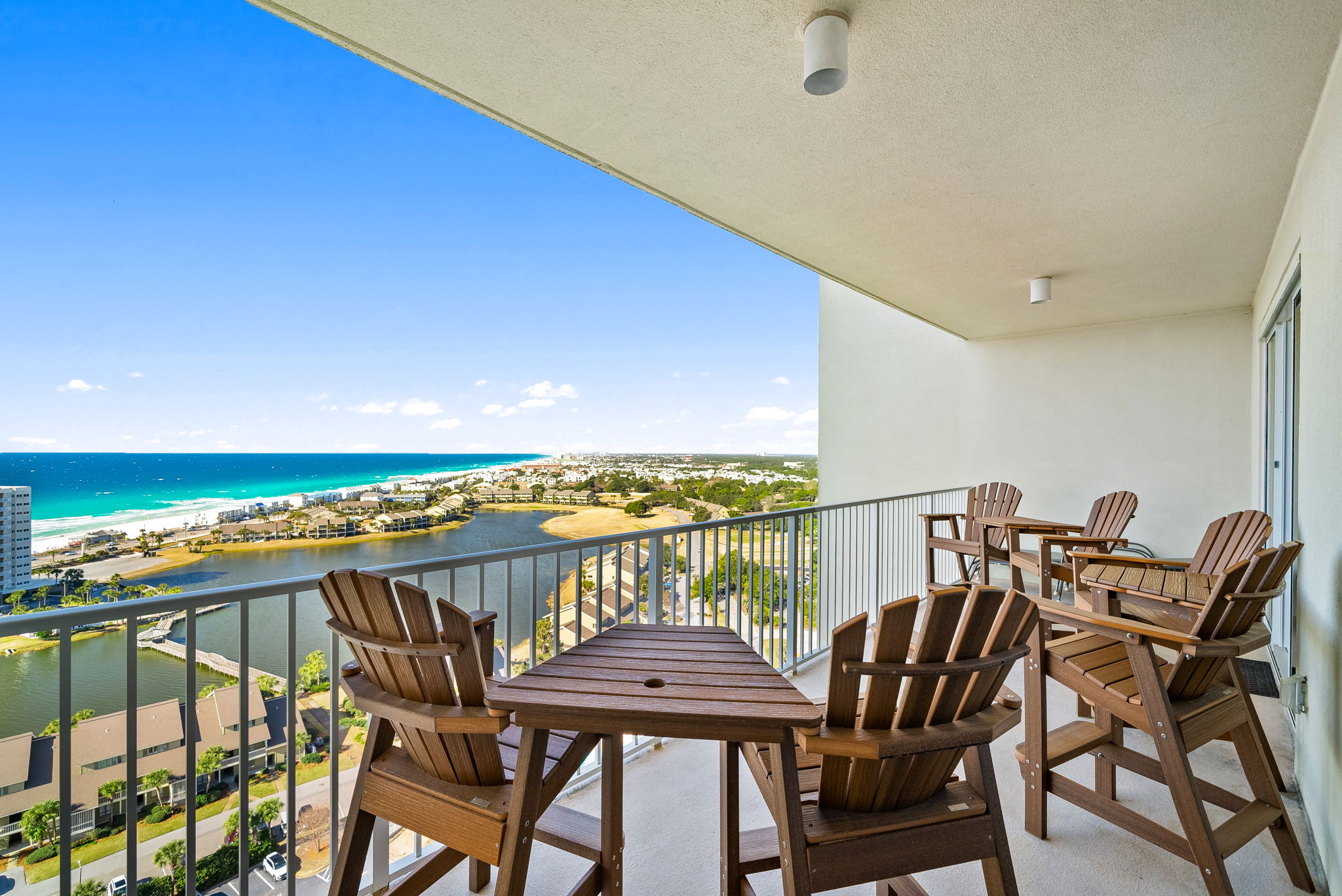Enjoy all the amenities of the beautiful Seascape Resort and amazing views from this 18th floor modern condo at Ariel Dunes2! With views of the Choctawhatchee Bay and 18-hole golf course from the front door and spectacular views of the Emerald Coast and Stewart Lake from the back door you may never want to leave. This 2 bedroom, 2 bath condo has it all and is perfect for the kids to have their own space. This spacious floor plan has 9-foot tall ceilings with 8-foot tall sliding glass doors for ocean views from both the living room and master suite. This 18th floor condo (1803), in Ariel Dunes II, features one of the best views in the building with miles of pristine beach on full display from the balcony! A very short walk to a private beach and you will be relaxing in the sand. This condo sleeps 6 with a master bedroom, guest bedroom and a pull-out sofa in the living room. There are LCD TVs in the master bedroom, guest bedroom and living room. Condo comes with in unit washer/dryer, wifi, cable TV, and fitness room access. Guests booking through our website also have the option for Pack' N play rental.