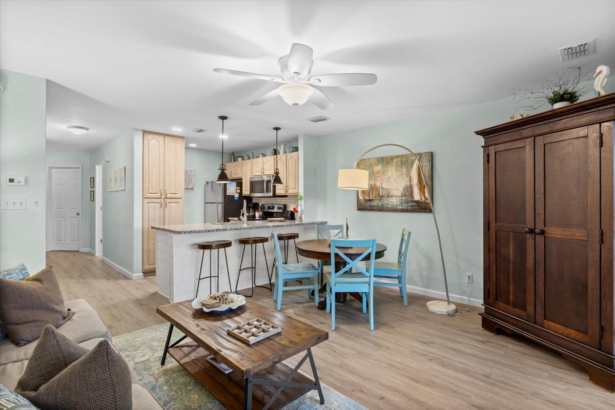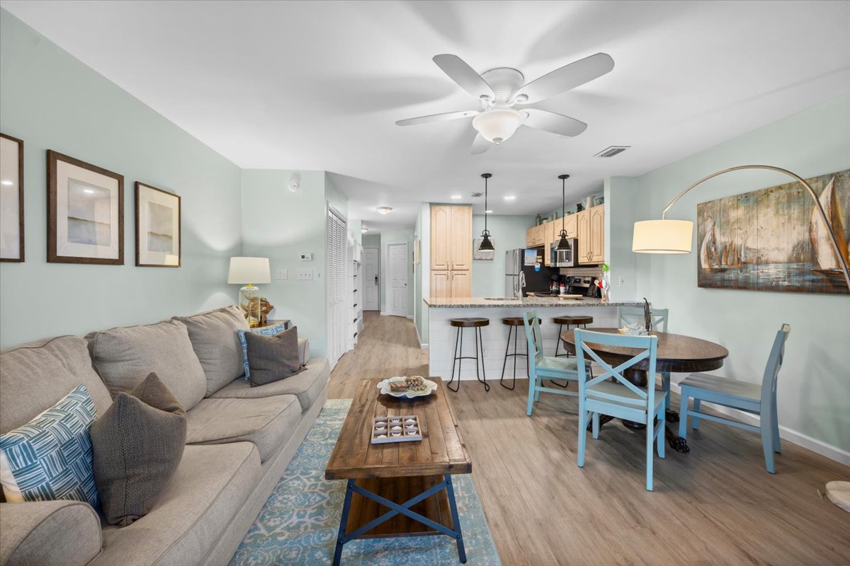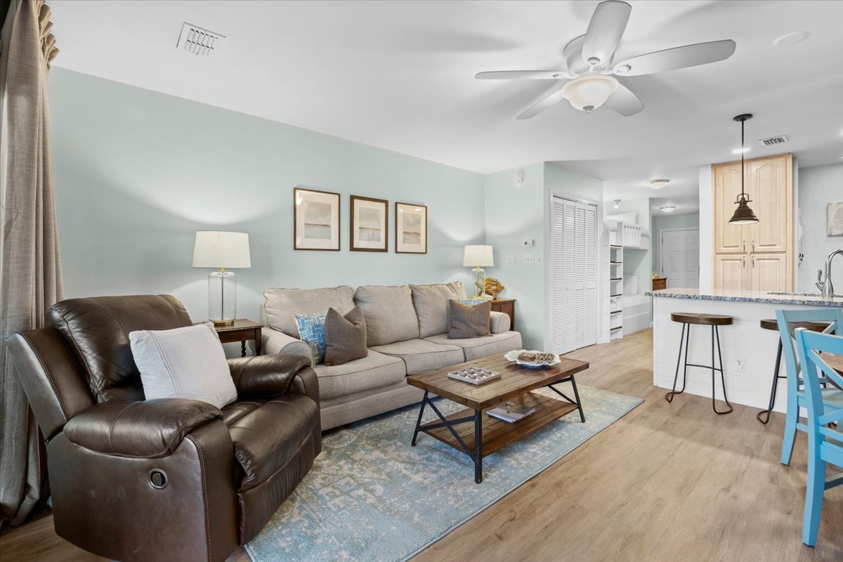 Enjoy the quiet, peaceful setting of this Golf Course Villa that is just minutes away from the beautiful white sand of Miramar Beach! The unit is completely updated with all new appliances including washer and dryer in unit. It features one bedroom with a king size bed in the master and bunk bed in the common area, plus a full size pull out sleeper sofa in the living room. The high ceilings in the living and dining room add to the spacious feel to these beautiful areas with a breathtaking view of Seascape Resort. Enjoy your morning coffee or evening refreshments on the large balcony. Just a 3 minute walk across the street and you will find yourself at the beach - with your toes in the sand. There is onsite Golf, Tennis, Pickleball, Dining, Swimming Pools, Water Sports, Arcade, Bike Rentals and the largest, pristine and privately – owned beach in the Destin/Miramar Beach, Florida area. When you book your vacation rental with 3D Beach Rentals directly, you have the option to add beach a Pak N Play. Seascape Resort is located between Destin and 30A, within close proximity to world-class shopping, dining and family entertainment.